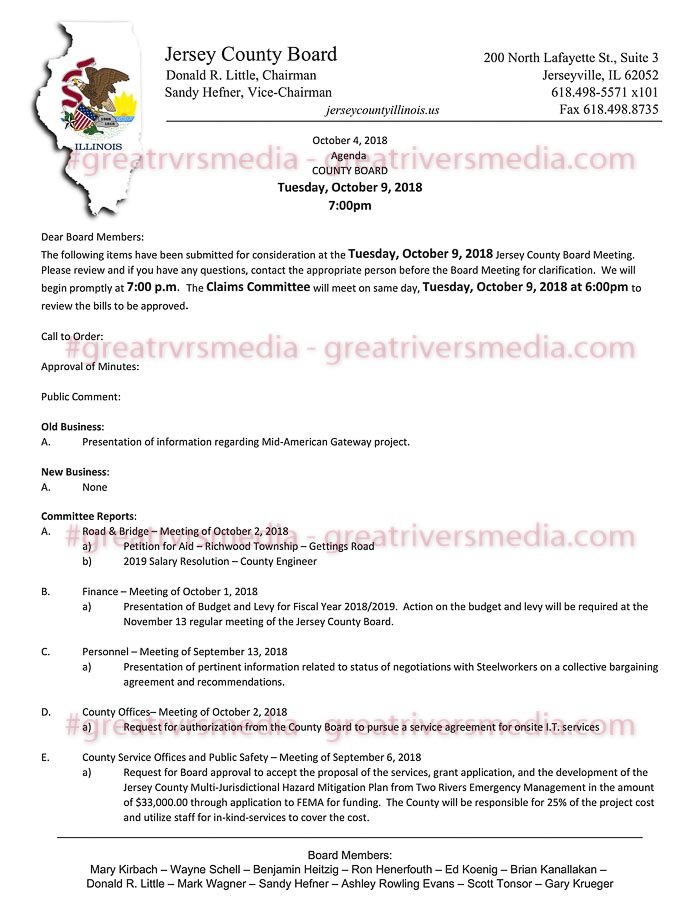 JERSEYVILLE - The monthly Jersey County Board meeting scheduled for 7 pm this evening should be an interesting one as Jerseyville Mayor Billy Russell is slated to update the board on the rail project that has raised considerable questions. It's not known at this time if the presentation will include written documentation that substantiates past and ongoing claims or if the audience will once again be listening to assurances with little or no documentation as has been the past practice of almost everyone associated with the project.